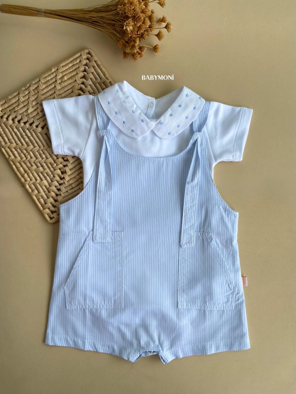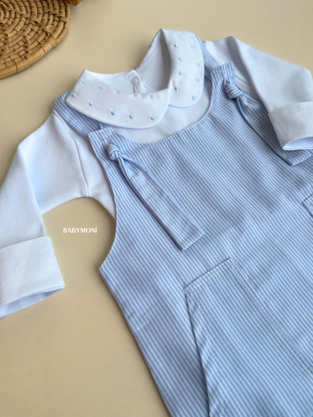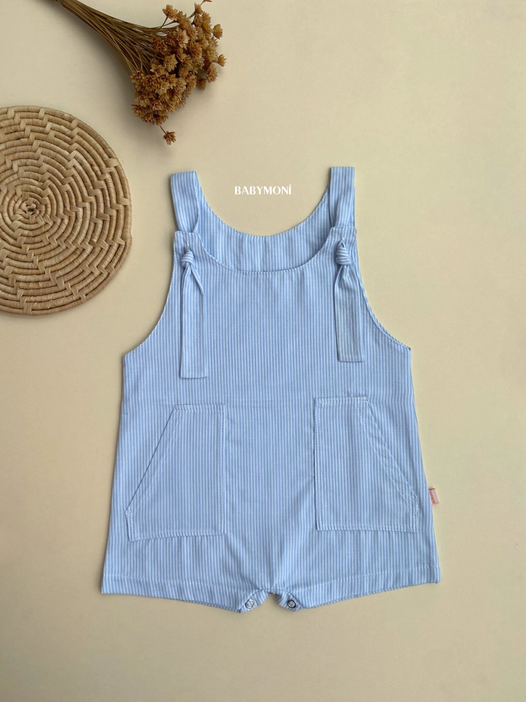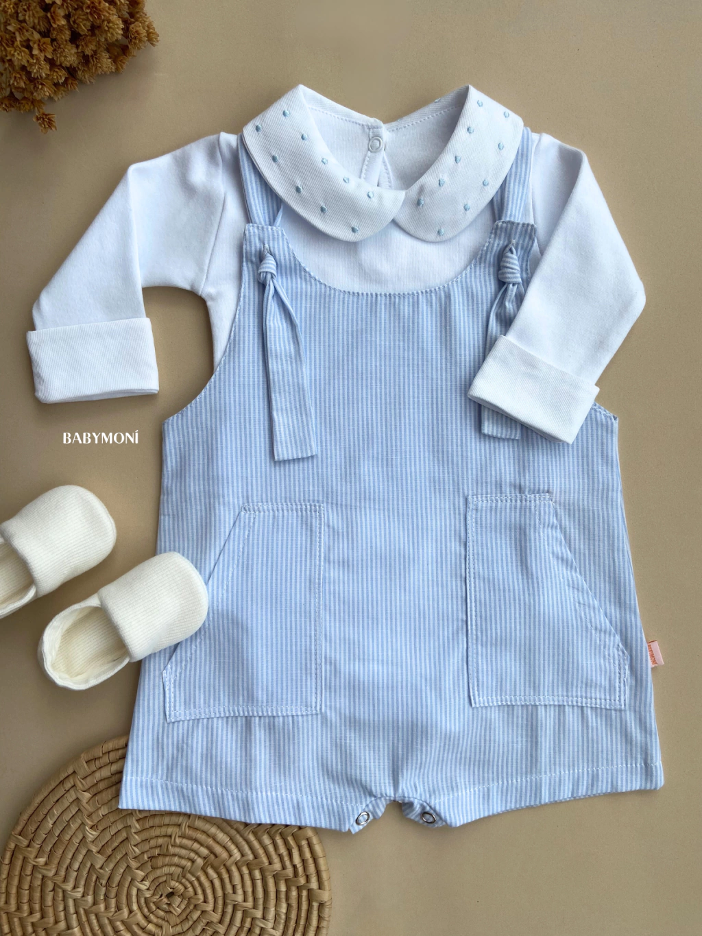 1 Jardineira 100% algodão de tecido leve com bolsos transversais, alças reguláveis em nó e abertura entre as pernas com botão de pressão.